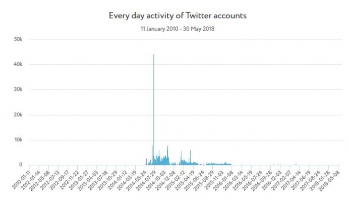 Журналісти дослідили інформаційні атаки російської "фабрики тролів" на Україну, починаючи з 2010 року. Виявилось, що до анексії Криму Україна майже не цікавила ботів. Вони активізувалися в період виборів президента у травні 2014 року.