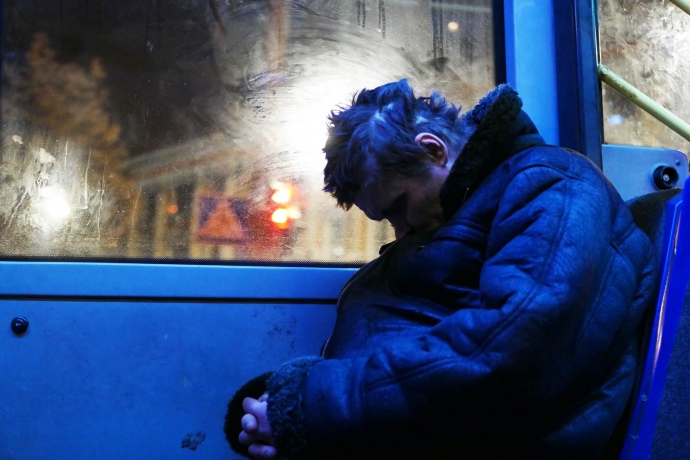 Он зашел в троллейбус с полчаса назад и вмиг уснул. Его поза не изменится в течение долгого времени: сложенные в замок руки обхватили живот, тяжелая голова упала вниз, уткнувшись подбородком в грудь.