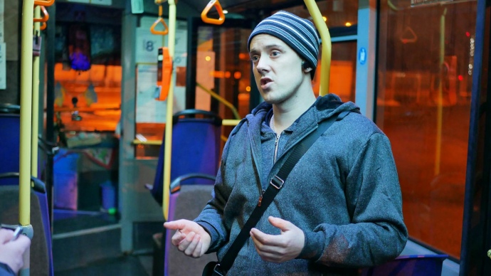 2:30. В конце салона сидит молодой парень Юра. Он из той касты странных людей, которые надевают в столь позднее время солнцезащитные очки. Кажется, Юра хочет быть незаметным. Но все происходит с точностью до наоборот.