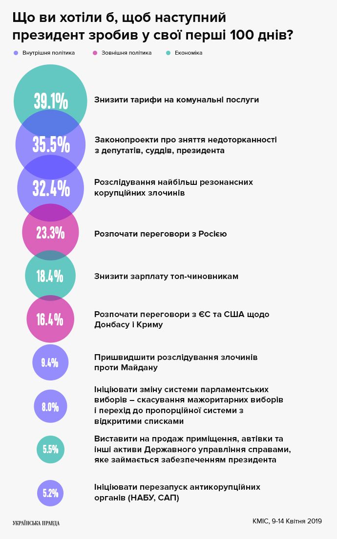 Але радіти з цієї ситуації Зеленському не варто. 40% його виборців вимагають від нього у перші ж 100 днів президентства знизити тарифи, більше 30% хочуть зняття недоторканності з влади та посадок корупціонерів, а ще чверть – переговорів з Росією.