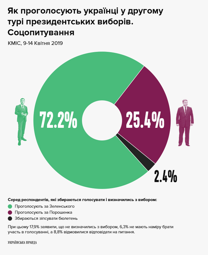 Навпаки – соціологія фіксує зростання розриву між кандидатами. Тепер Зеленський випереджає Порошенка майже втричі: 72% на 25%.