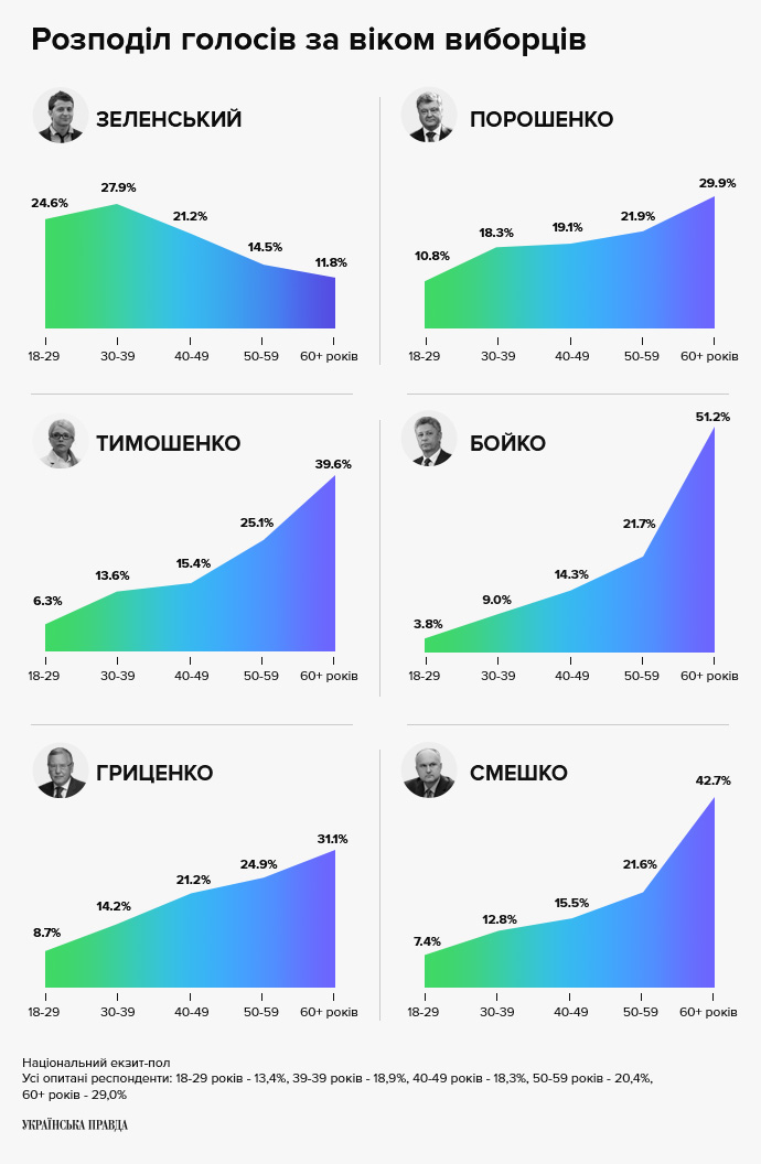 У чинного президента всього 10,8% виборців входять до вікової групи 18-29 років, 18,3% мають від 30 до 39 років, 19,1% – від 40 до 49 років, 21,9% – від 50 до 59 років. Найчисельніша група прихильників Порошенка є одночасно і найстаршою – 29,9% його прихильників мають 60+ років.