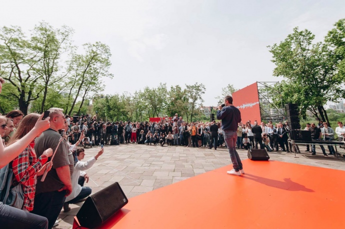 Між тим, недалеко від фундаменту Десятинної церкви, звідки "стала бить земля Руськая", під стіною Історичного музею розмістилась невелика сцена з новим політичним гаслом, яке і прийшов презентувати Вакарчук: "Я – голос змін".