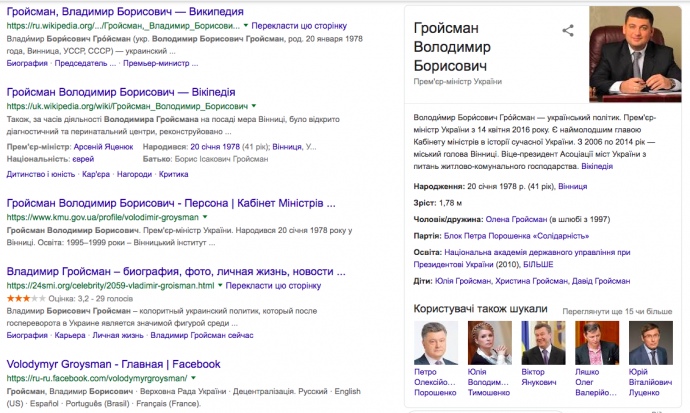 У першій 10-тці пошукової видачі ви побачите посилання на Вікіпедію, Фейсбук та інші соцмережі політика, а також кілька безневинних досьє на маловідомих сайтах.