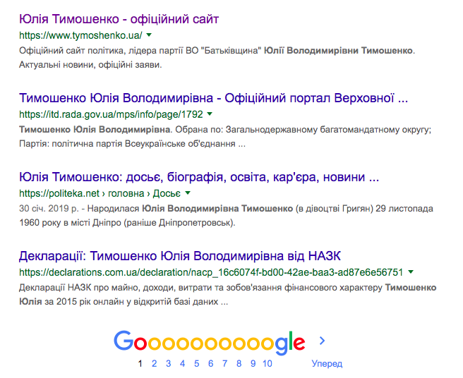 Зробити власний сайт і "прокачати" його під конкретні запити – відносно простий і безпечний метод потрапити в ТОП Гугла. Наприклад, якщо загуглити "Юлія Тимошенко" у першій десятці обов'язково знайдуться її сторінки.