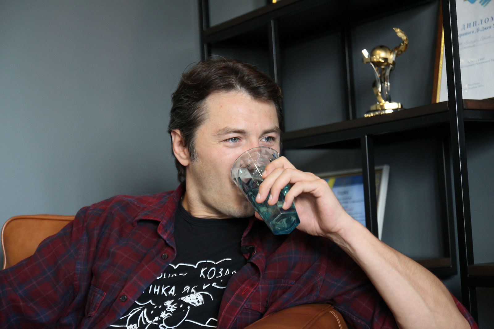 Телеведучий запросив "Українську правду" до себе додому. Розмову ми записували у його домашньому кабінеті на другому поверсі красивої київської квартири. На полицях кабінету виставлені різні нагороди й грамоти телеведучого за творчу і волонтерську діяльність.