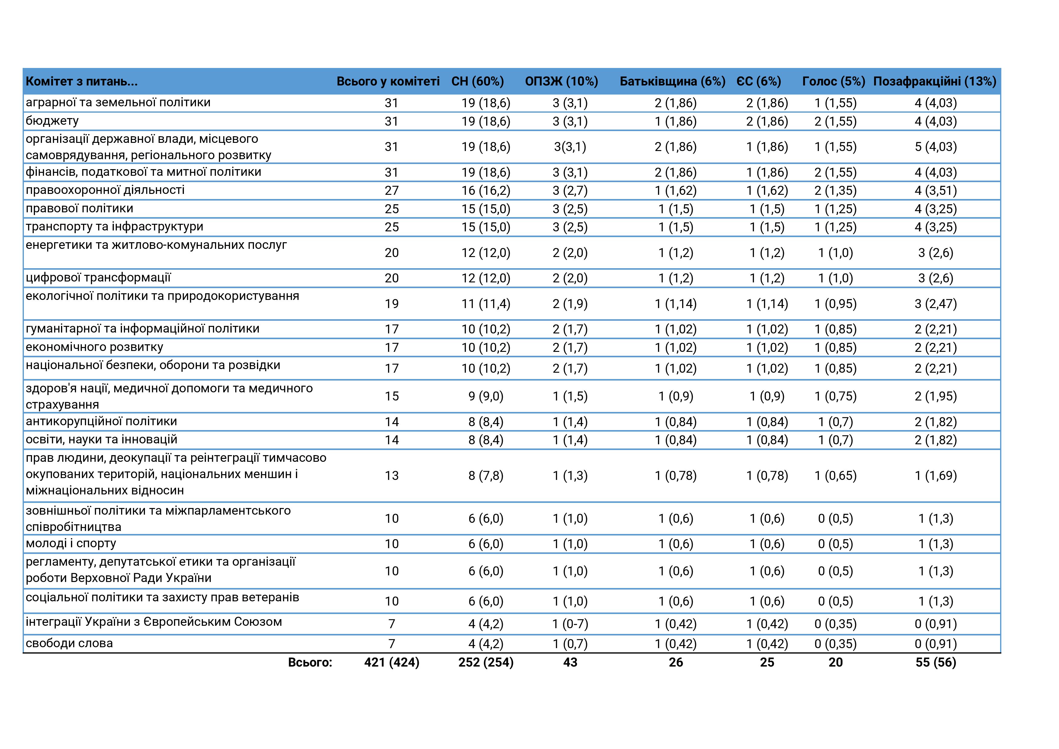 Ще 13% місць у кожному комітеті припадає на позафракційних депутатів.