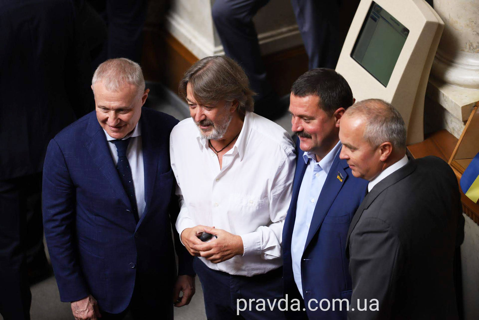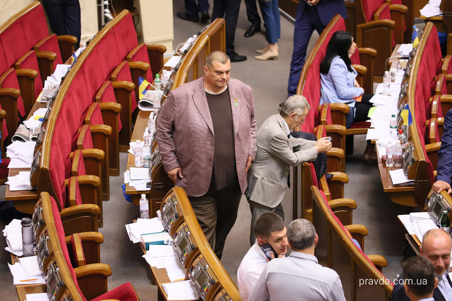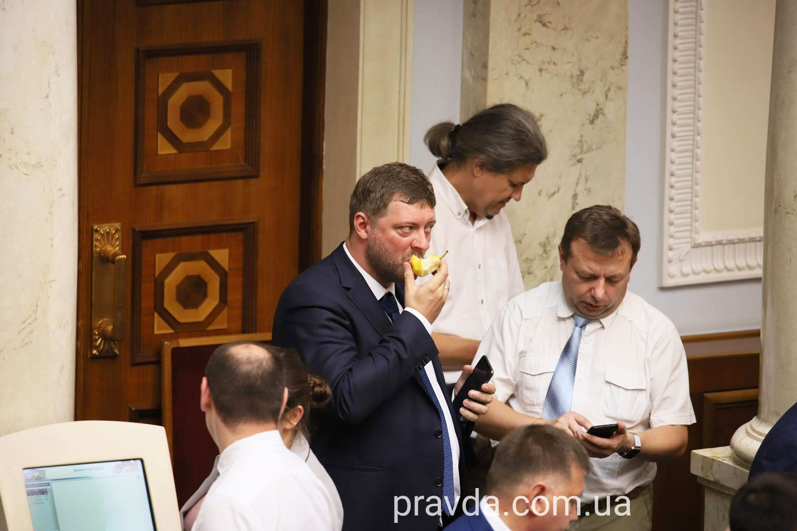 Заступник голови фракції "Слуга народу" Юрій "Юзік" Корявченков дивиться в зал. І, схоже, думає. "Юзіка" посадили на спеціально розширені місця, де колись сиділи такі люди, як Юхим Звягільський. Останній, до речі, вперше в історії України не пройшов у парламент