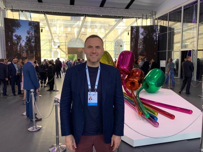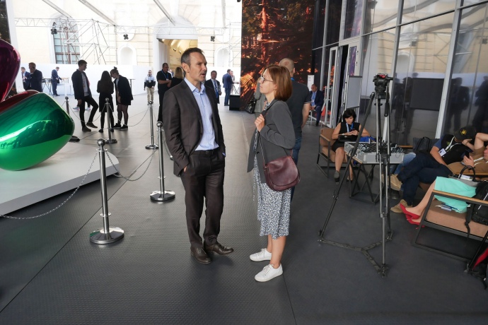 Новоолігарх Павло Фукс уважно розгллядає скульптуру Джеффа Кунса "Тюльпани", що знаходиться між залом для виступів та залом для банкету.