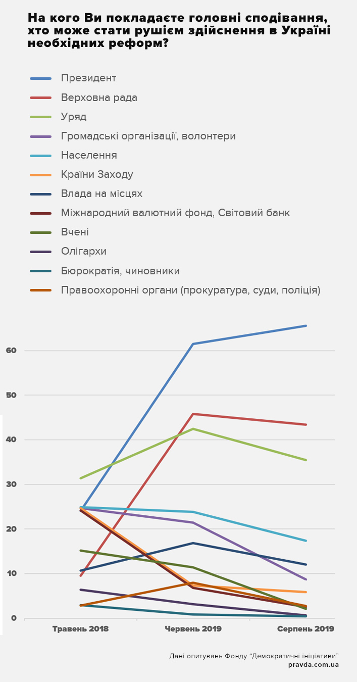 Після обрання Володимира Зеленського ситуація кардинально змінилась: президента як головного гаранта просування реформ у країні стали розглядати 61,5%, майбутню Верховну Раду – 46%, а уряд – 42,5% опитаних.