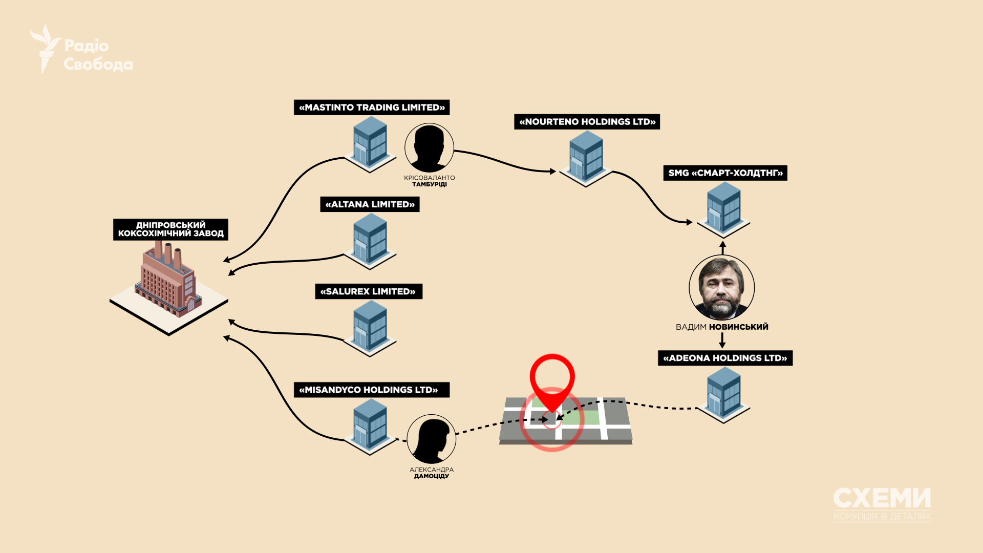 У 2018 році також відбулися зміни у структурі власності ще одного власника Дніпровського коксохіму – кіпрської "Misandyco Holdings Ltd". Фірму переписали на кіпріотку Александру Дамоціду (Alexandra Damotsidoy) й перереєстрували за однією адресою із іншою кіпрською компанією, якою володіє безпосередньо Вадим Новинський – "Adeona holdings limited".