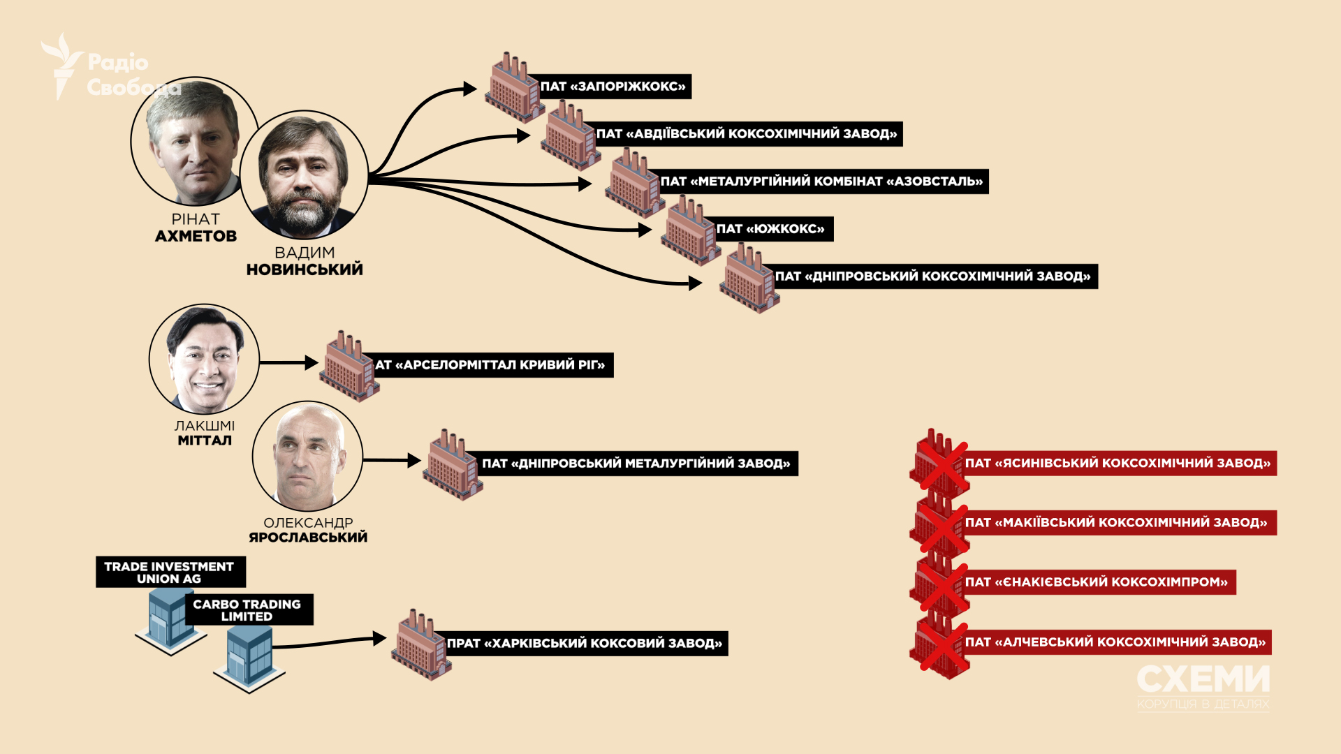 Так, "Авдіївський коксохімічний завод", "Металургійний комбінат "Азовсталь" та "Запоріжкокс" були у власності Ахметова та Новинського ще до окупації Донбасу. Натомість, "Дніпровський коксохімічний завод" та "Южкокс" тоді належали російському олігарху Роману Абрамовичу.