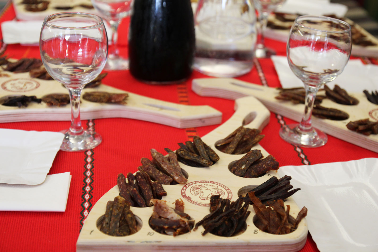 Во время дегустации Сергей Русев дает попробовать все виды вяленого мяса, при этом рассказывая, как и из чего оно сделано