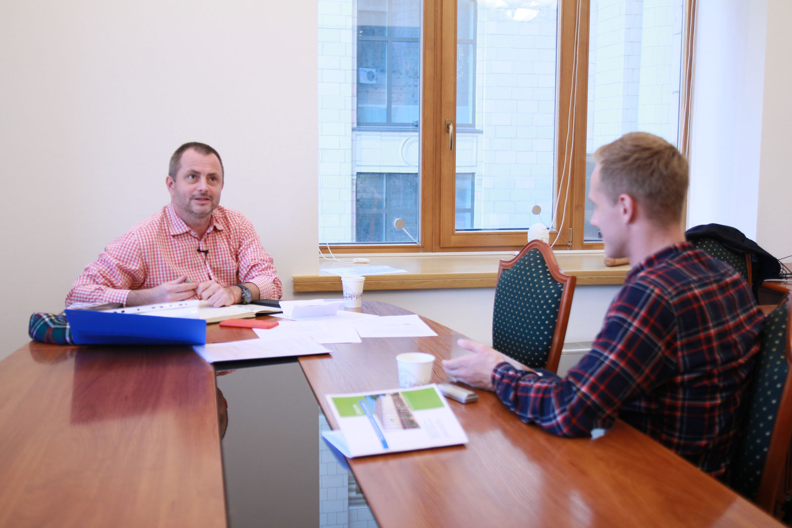 Бахматов перериває інтерв’ю на коротку розмову з Віталієм Кличком, який зайшов у його кабінет.