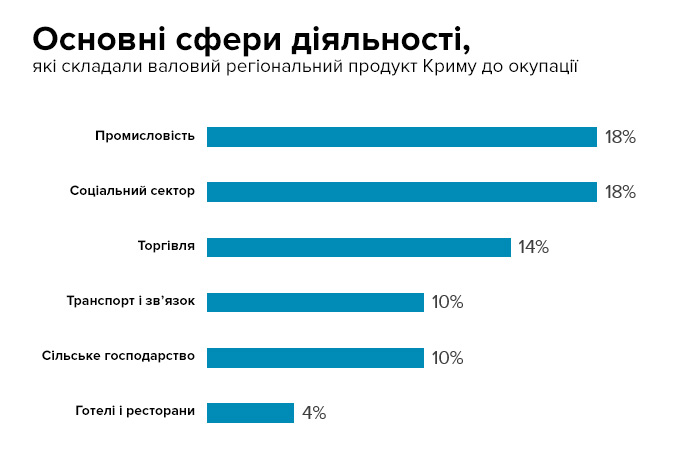 У таких умовах шанси мають хіба що соціальний і державний сектори, які отримують мільярдне фінансування з Москви. Бюджет окупованого Криму сягнув 2 мільярдів доларів, з яких приблизно 85% дає Росія.