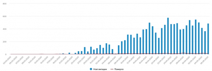 Після першого за 8 днів зниження кількості добових хворих по всій країні до позначки менше 400 їхнє число знов підстрибнуло до майже 500. Упродовж 5 травня зареєстрували 487 нових хворих.