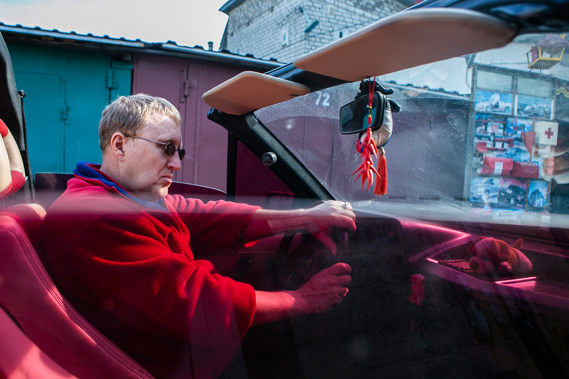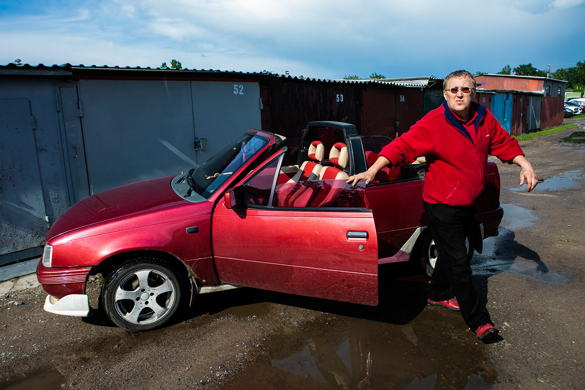 "Когда покупал ("Опель"), друг говорил: "Мы тебе мотор сделаем, будешь кайф получать", – объясняет Алексей. – 10 лет езжу, никак не могу удовольствие получить, не едет так, как хотелось бы. (Уникальность этой машины в том, что) красный цвет и кабриолет. Крыша вручную открывается, в те годы не было кнопок. Красный цвет нравится, потому что контраст. Сейчас, правда, перешел на белый. Белый "кабан" у меня и белая собака".