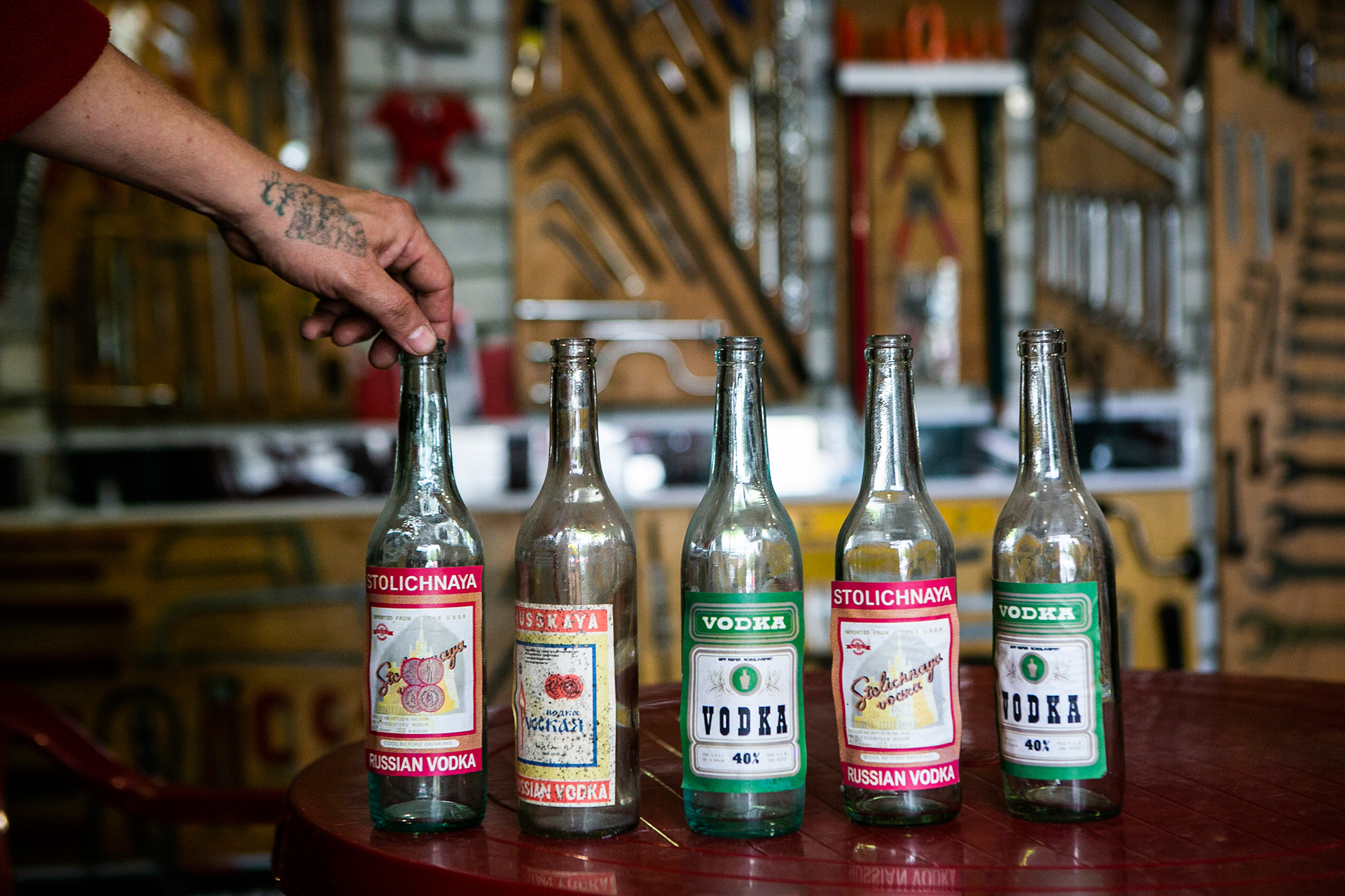 Алексей показывает многочисленные артефакты со съемочной площадки – водку "Stolichnaya", сигареты "Север" и другие новоделы, имитирующие советское прошлое.