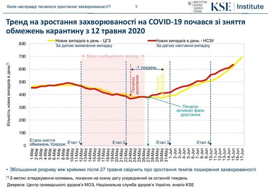 Складно однозначно стверджувати, що більше вплинуло на ріст статистики – збільшення кількості проведених тестів, чи пом'якшення карантину та активізація соціальних контактів. Але якщо переглянути інфографіку, підготовлену Міністерством охорони здоров’я, яка включає в себе динаміку тестування і зростання кількості хворих, то видно, що новий пік відбувся саме після пом’якшення карантину.
