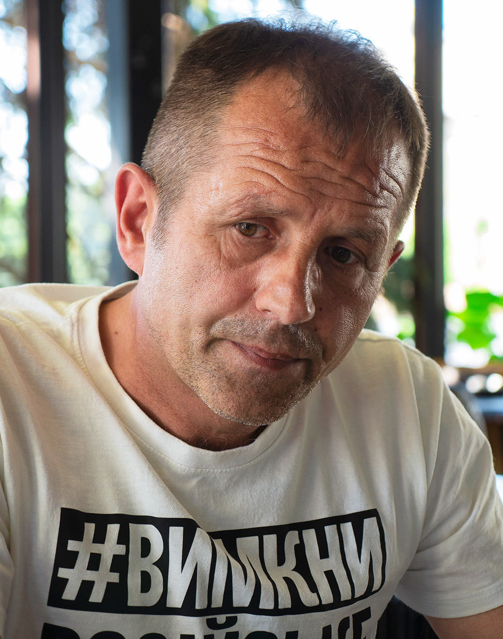 На Балуху біла футболка з написом "Вимкни російське", а в руках – люлька. Він багато говорить про розчарування владою Зеленського, називає главу ОПУ Андрія Єрмака "спецоперацією Кремля", радіє за побратимів-політв’язнів, які збираються в політику, і розчулюється, коли говорить про Крим, любов і маму.