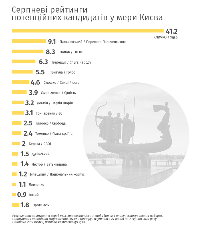 Крім того, дехто з’являється у рейтингах соціологів навіть без чітких заяв про участь у виборах. Це, наприклад, Ігор Смешко, чия партія ще "не визначилась". Формально навіть Попов, якому пророкують третє місце і чиєю рекламою вже у серпні почали завішувати Київ, поки остаточно не підтвердив свої амбіції.