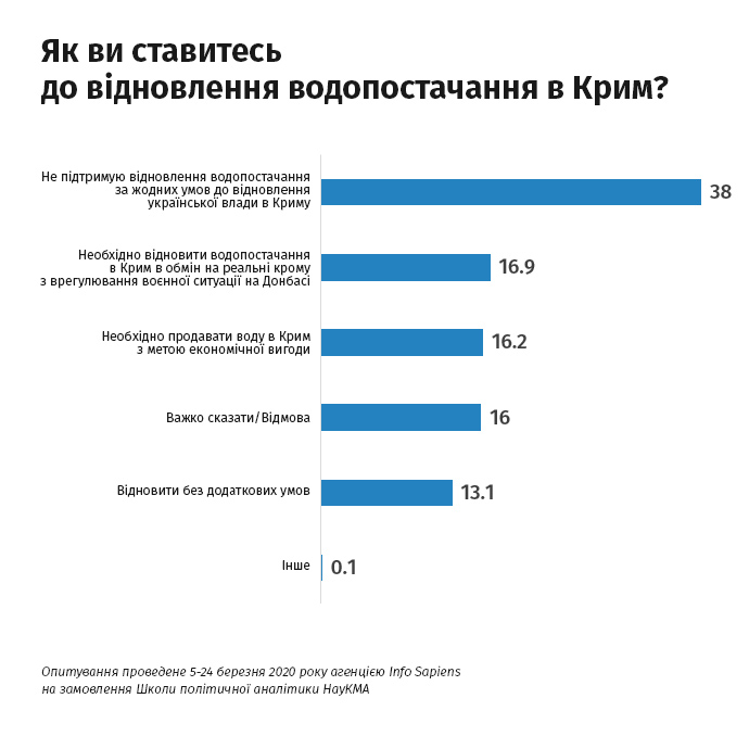 Статистика свідчить, що 36,5% українців повністю або частково виступають проти подачі води в окупований Крим, 33,1% – повністю або частково, говорить березневе дослідження агенції Info Sapiens на замовлення Школи політичної аналітики НауКМА.