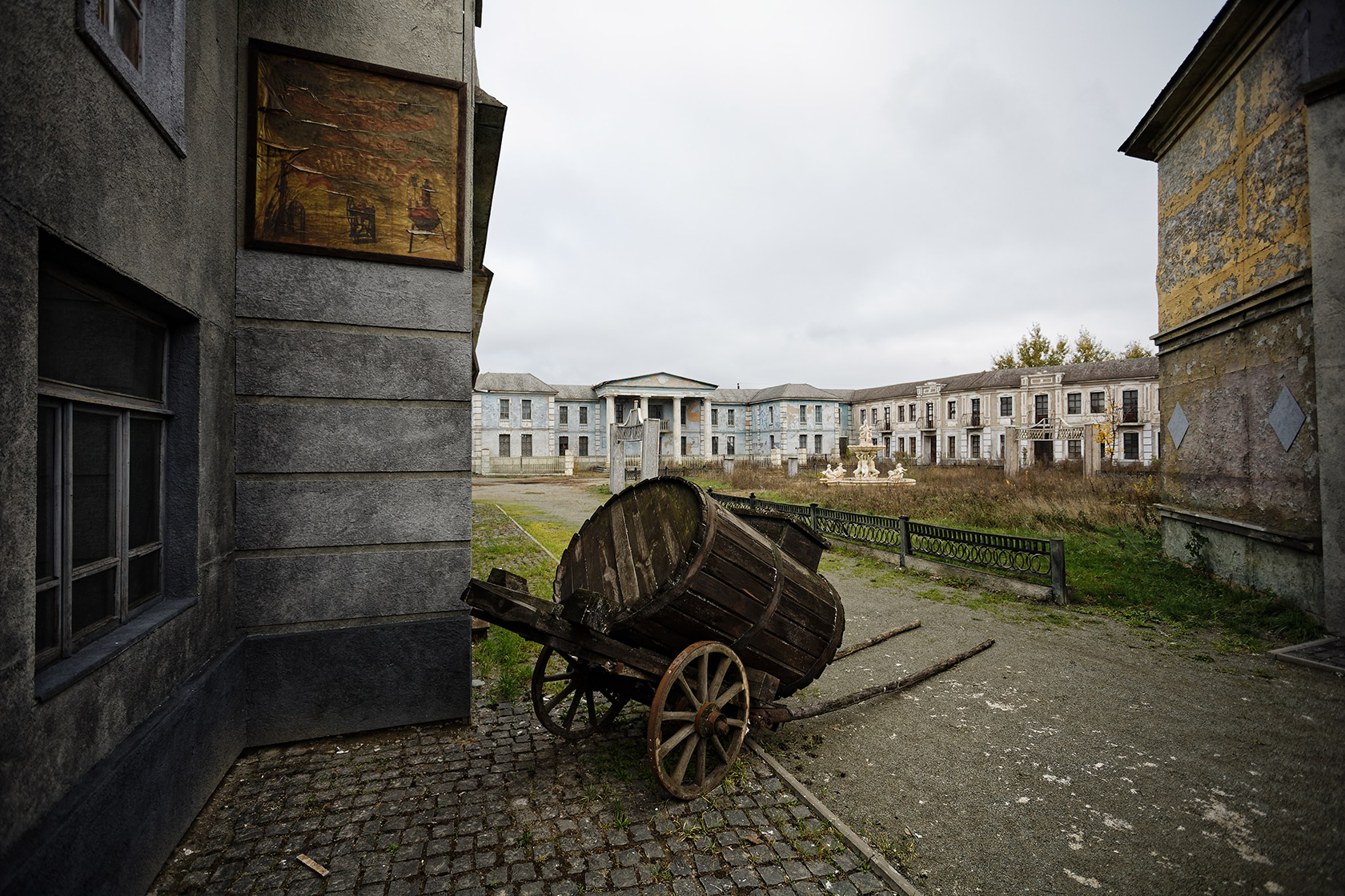 Бутафорский хутор, за которым находятся поле и реальный лес, кажется настоящим. Издалека хаты с соломенными крышами, мельницы, колодцы, телеги выглядят вполне реалистично. Но стоит открыть дверь любого дома – внутри мусор и каркасы нежилых конструкций.