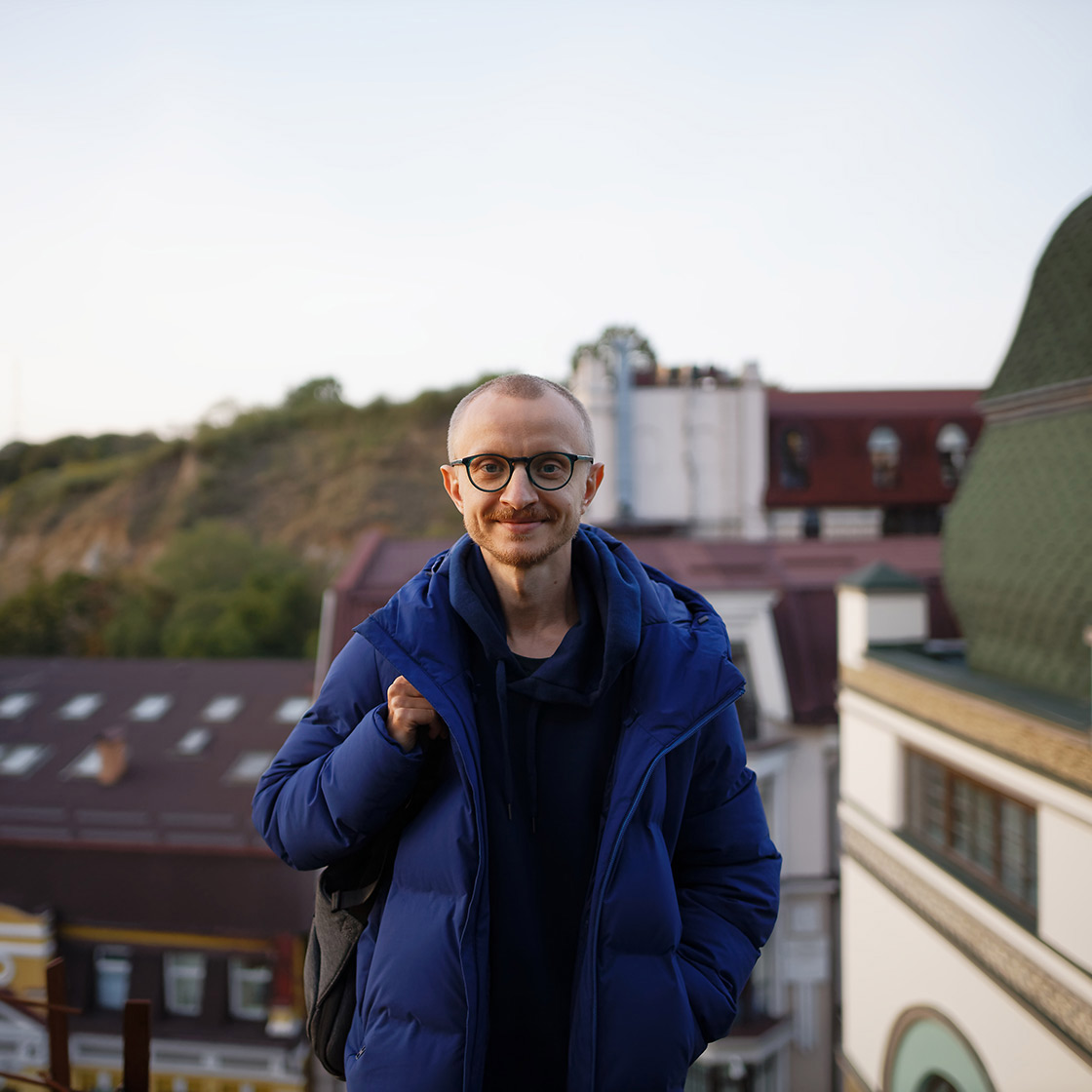 Співзасновник креативного агентства Banda Паша Вржещ стоїть на даху офісного центру на Воздвиженці.