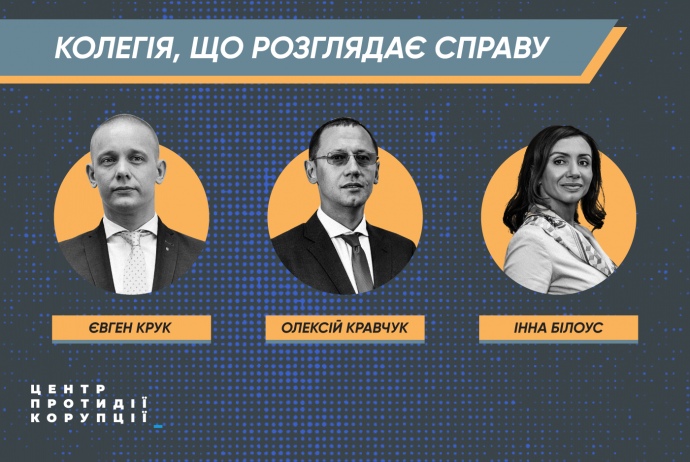 Ще одна справа стосується судді-втікача Руслана Юхимука, якого обвинувачують в отриманні 4 тисяч доларів хабара. Її слухають судді Катерина Сікора, Тетяна Гавриленко та голова Антикорсуду Олена Танасевич.
