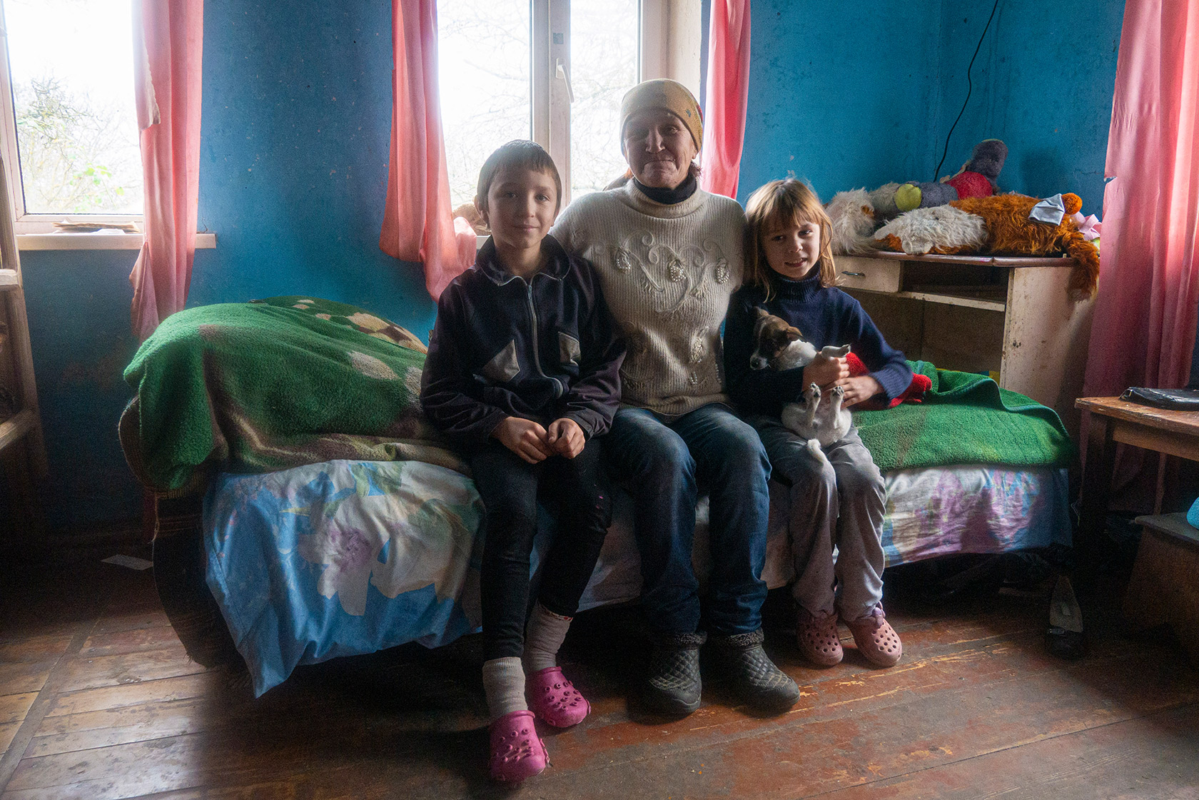 На ліжку біля гарячої грубки гріється маленька Руслана. Дитя, яке ще не втратило захоплений погляд на світ, заливається сміхом.