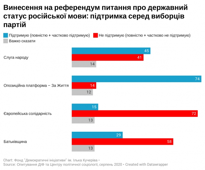 Відмінності у ставленні до такого референдуму найяскравіше видно серед прихильників різних партій. Таку ініціативу повністю підтримали б 64% виборців "Слуги народу", 73,4% виборців "Опозиційної платформи-за Життя", 59,8% – виборців "Батьківщини" та 38,9% виборців "Європейської солідарності".