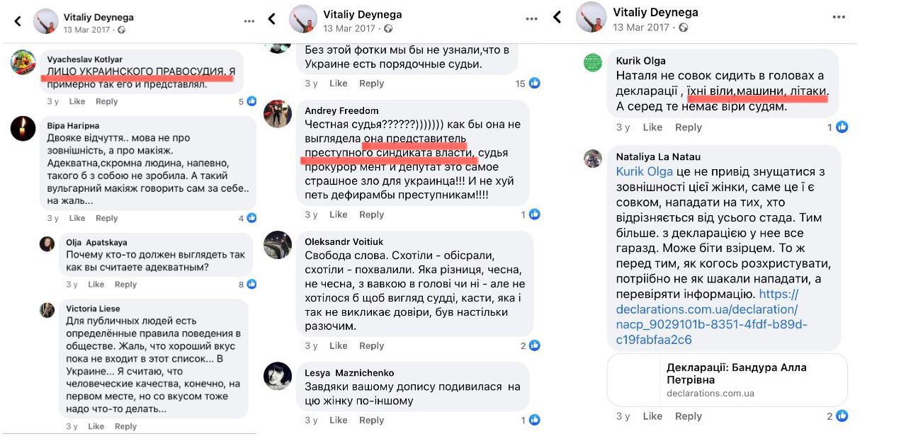 Служительница Фемиды вызвала волну насмешек своим аляповатым макияжем и безвкусной прической. Обсуждение ее внешности настолько увлекло фейсбук-сообщество, что о ней написала даже британская Daily Mail, сравнившая украинскую судью с ведьмой Урсулой из диснеевского мультфильма "Русалочка".