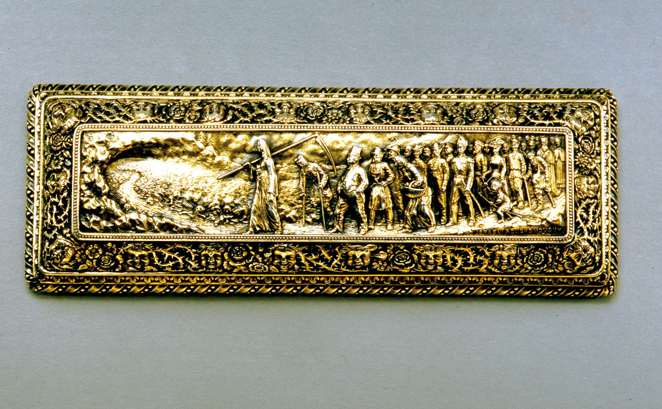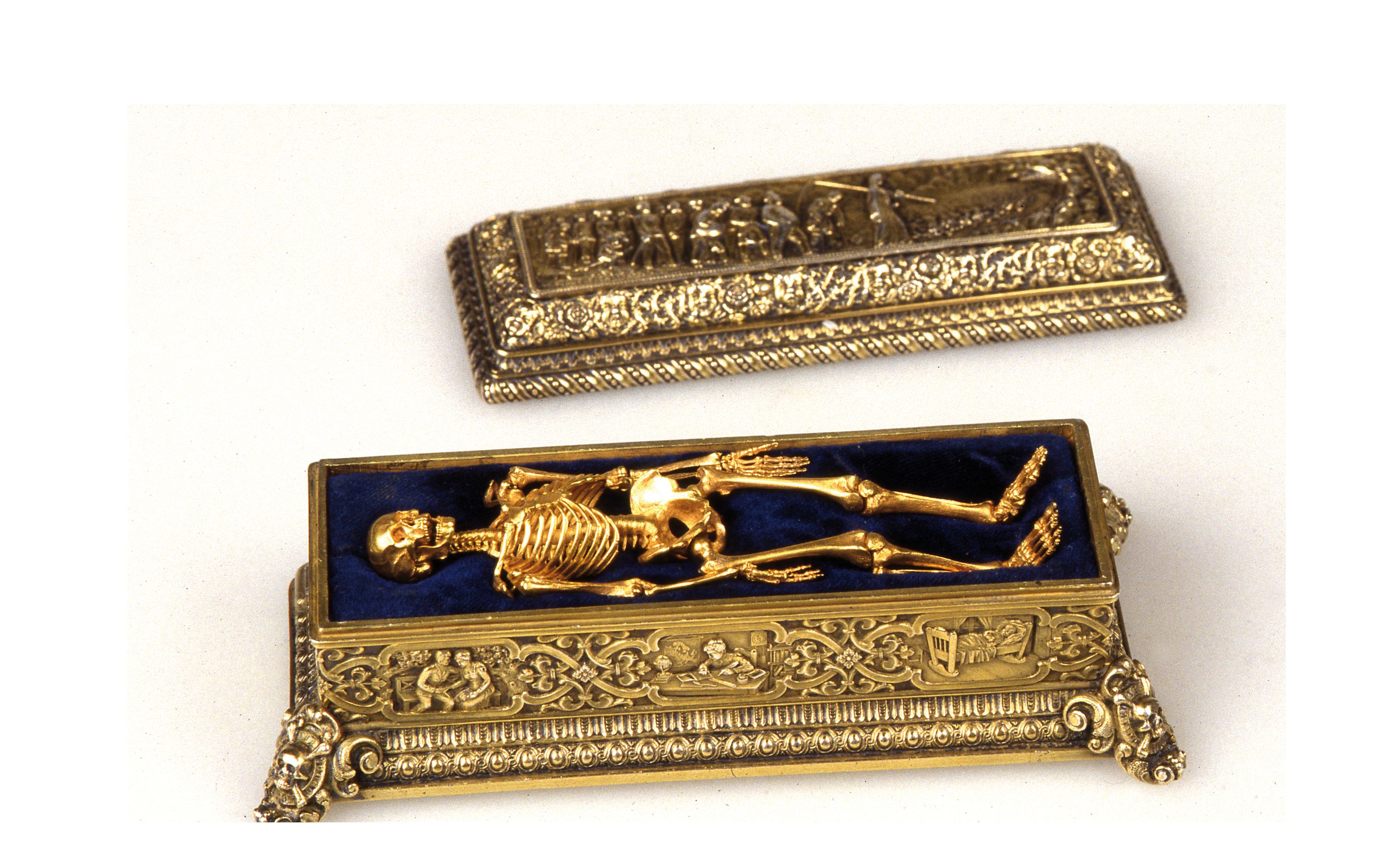 Вся поверхня коробочки зі скелетом покрита алегоричними сюжетами, панорамами і картинами різних етапів життя, від народження до смерті. На маленькому просторі майстер умістив понад півсотні одних тільки людських фігур, з найменшими відтінками виразів обличчя.