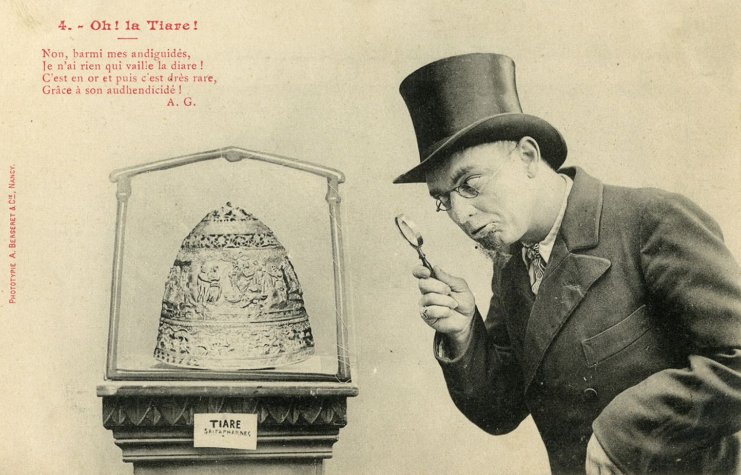 Навесні 1896 року в Париж з Відня прибув антиквар Антон Фогель і його компаньйон, маклер Шиманський. Рішучою ходою вони попрямували до Лувра, де, зовсім не червоніючи, запропонували купити золоту корону скіфського царя, нібито знайдену недалеко від Очакова.