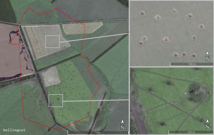 Ключові точки артилерійських атак журналісти визначали за допомогою супутникових знімків – на територіях, що зазнали найбільше ударів, залишились помітні скупчення воронок. Зокрема так було з Амвросіївкою на Донеччині – в українських ЗМІ та в соцмережах Bellingcat побачив повідомлення про обстріл українських військових артилерією РФ.