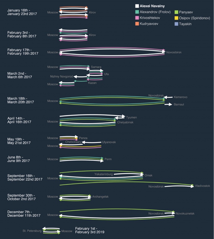 Оперативники слідкували за політиком щонайменше з січня 2017 року, відколи він оголосив про свої плани балотуватися у президенти, заявляють журналісти. Після того, як ЦВК відмовилась реєструвати Навального кандидатом, стеження припинилось, у 2020 – відновилось.