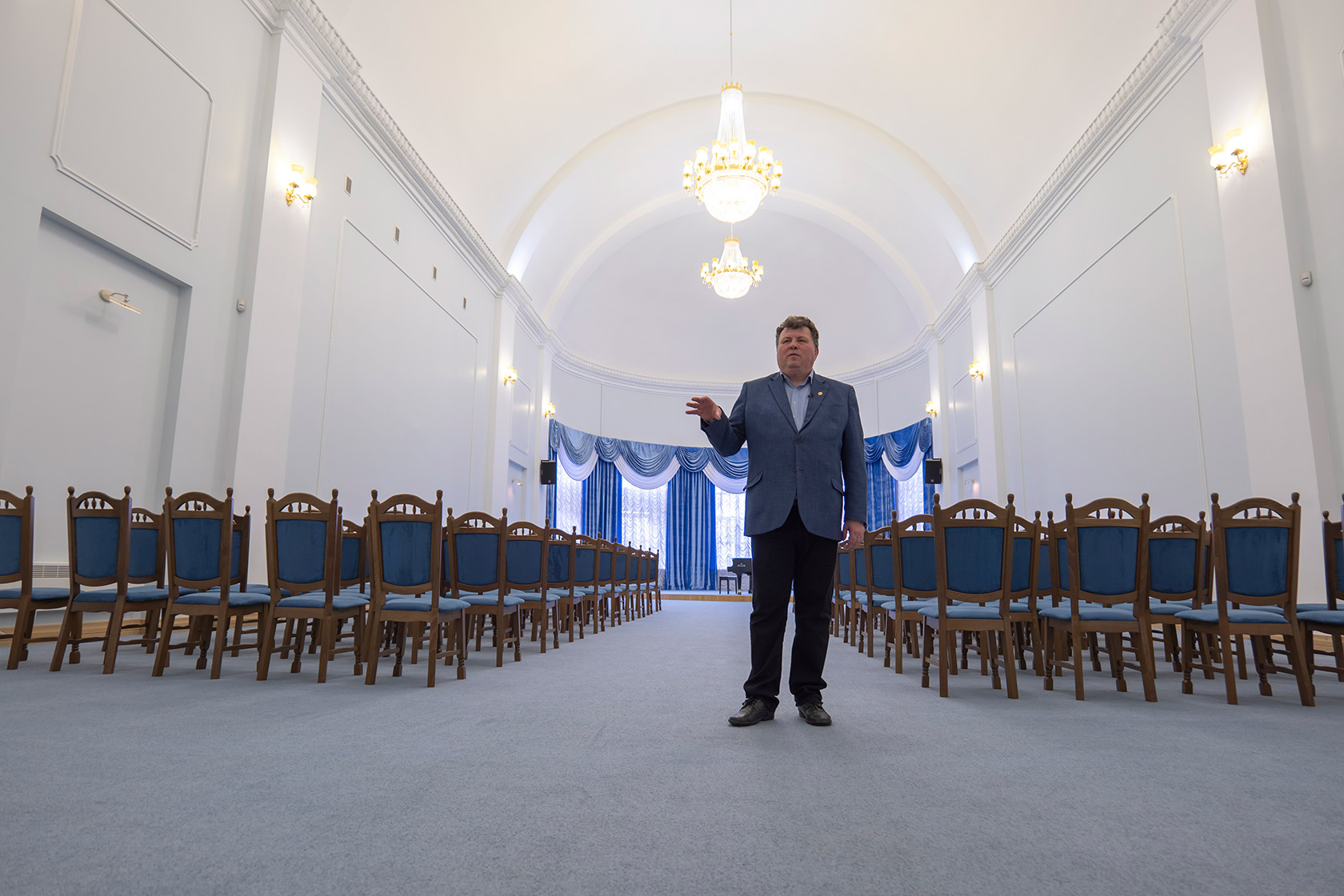 – Знаєте, я не хотів казати, – ніби соромлячись, але з посмішкою розповідає Бугров, – але це правда: тут у нас 190 місць, але коли хороші заходи, то приходить набагато більше людей і вони сідають прямо (на сходи – УП).