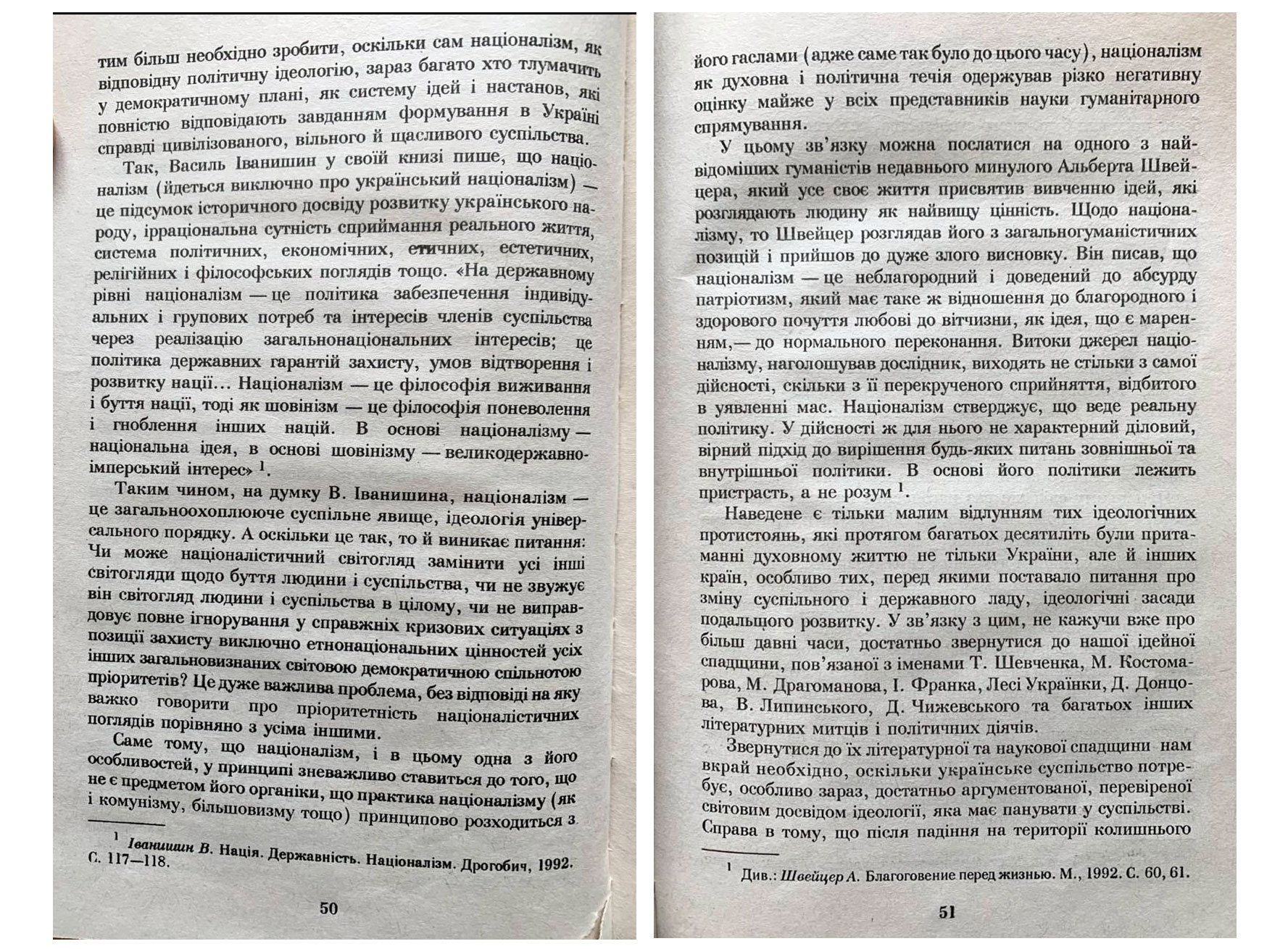 Далі він переходить до визначень націоналізму, зокрема демократичного українського варіанту і цитує працю політолога, керівника організації "Тризуб" ім. Степана Бандери Василя Іванишина. Також Медведчук наводить як приклад позицію Альберта Швейцера, який негативно оцінював націоналізм, як "доведений до абсурду патріотизм".