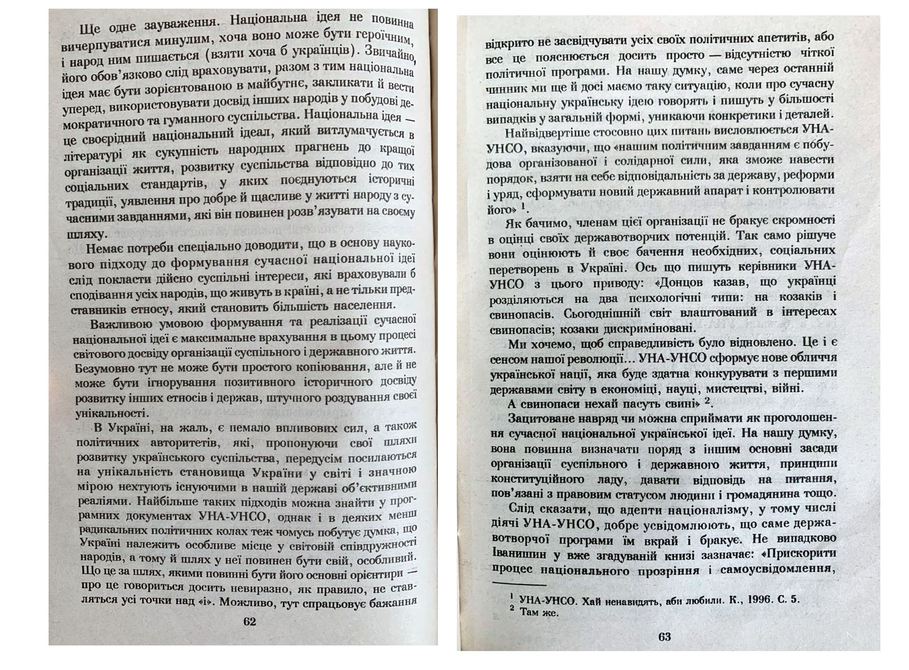 А ще цитати ідеолога українського інтегрального націоналізму Донцова, автора славнозвісної праці "Самостійна Україна" Міхновського, ідеолога українського монархізму Липинського, засновника української геополітичної концепції Липи, уривки з програми УНА-УНСО та роботи провідника організації "Тризуб" ім. Степана Бандери Іванишина.