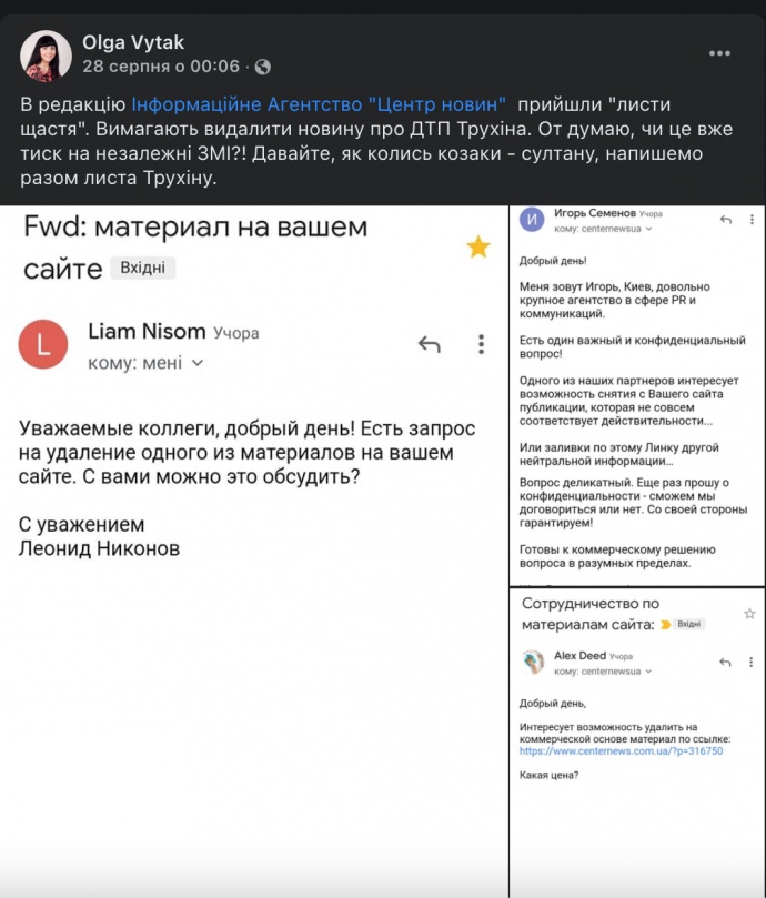 "Одного з наших партнерів цікавить можливість зняти з вашого сайту публікацію, яка не зовсім відповідає дійсності. Або залити за цим лінком іншу нейтральну інформацію. Питання делікатне, ще раз прошу про конфіденційність", – так виглядало одне з повідомлення від "Ігоря Семенова" з "доволі великого агентства у сфері PR і комунікацій".
