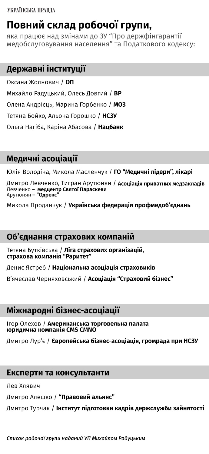 І навіть Радуцький, здається, теж не планує виступати за її згортання. Як розповідає членкиня робочої групи при комітеті, Юлія Брикульська з ГО "Медичні лідери", політик навіть відкрито заявив про це страховикам.