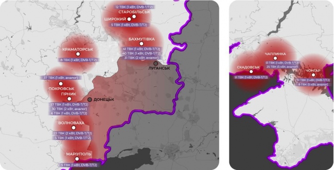 Карта покриття "Дому" показує, що зона впевненого прийому сигналу ледь доходить до до Луганська. У Криму вона охоплює крайню північ півострова.