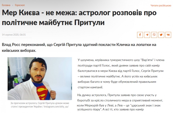 "До речі, Київ перебуває під впливом знаків Лева й Овна, а у Притули Білий Місяць у знаку Овна, тож він — "білий воїн" (його активна волонтерська діяльність і величезна допомога українській армії є тому доказом). Не виключено, що згодом Сергій Притула стане і президентом України", — зазначив тоді Росс.