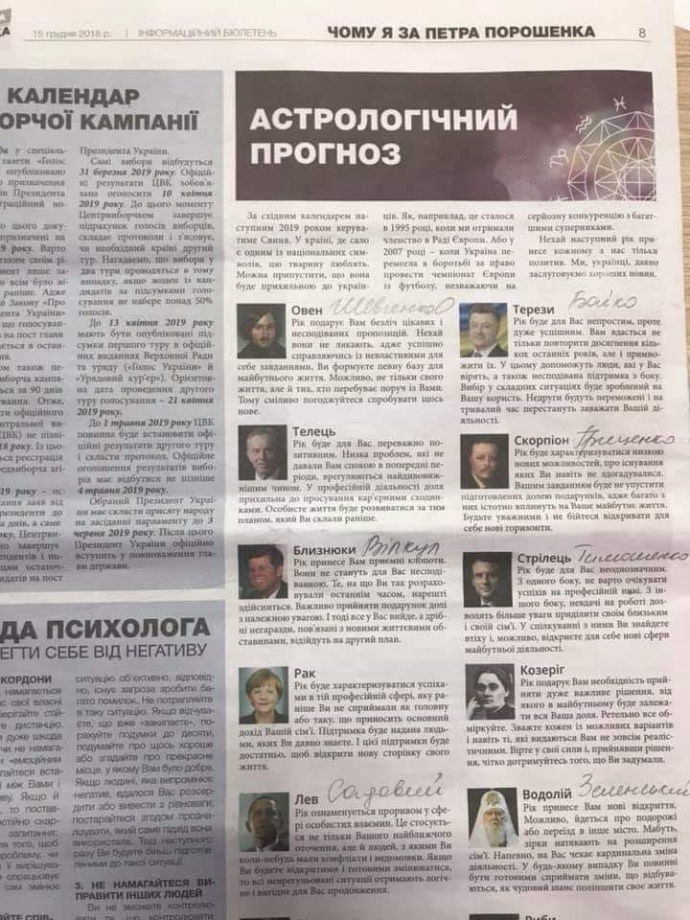 Звісно, що в цьому гороскопі нічого хорошого стрільцеві (Тимошенко) чи водолію (Зеленському) не передбачалось. Останньому гороскоп Порошенка пророкував переїзд в інше місто і розширення сім’ї, а стрільцеві — невдачі на роботі, які також дадуть можливість більше часу присвятити родині.