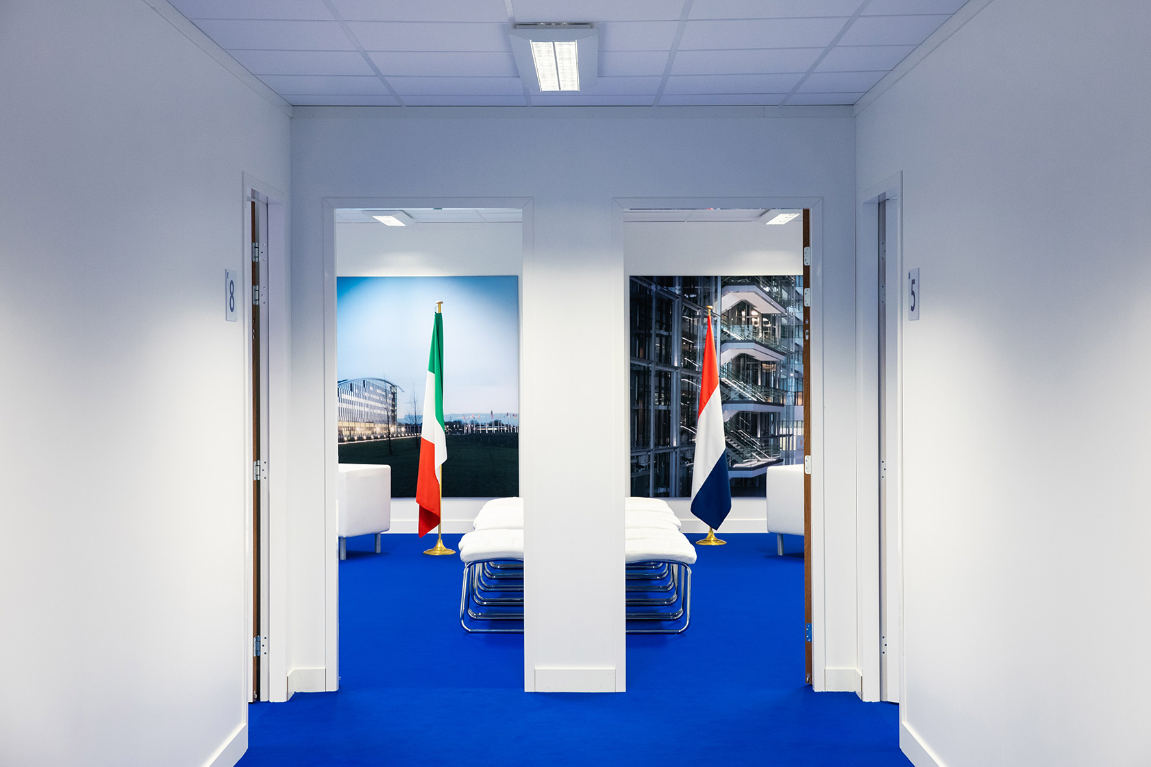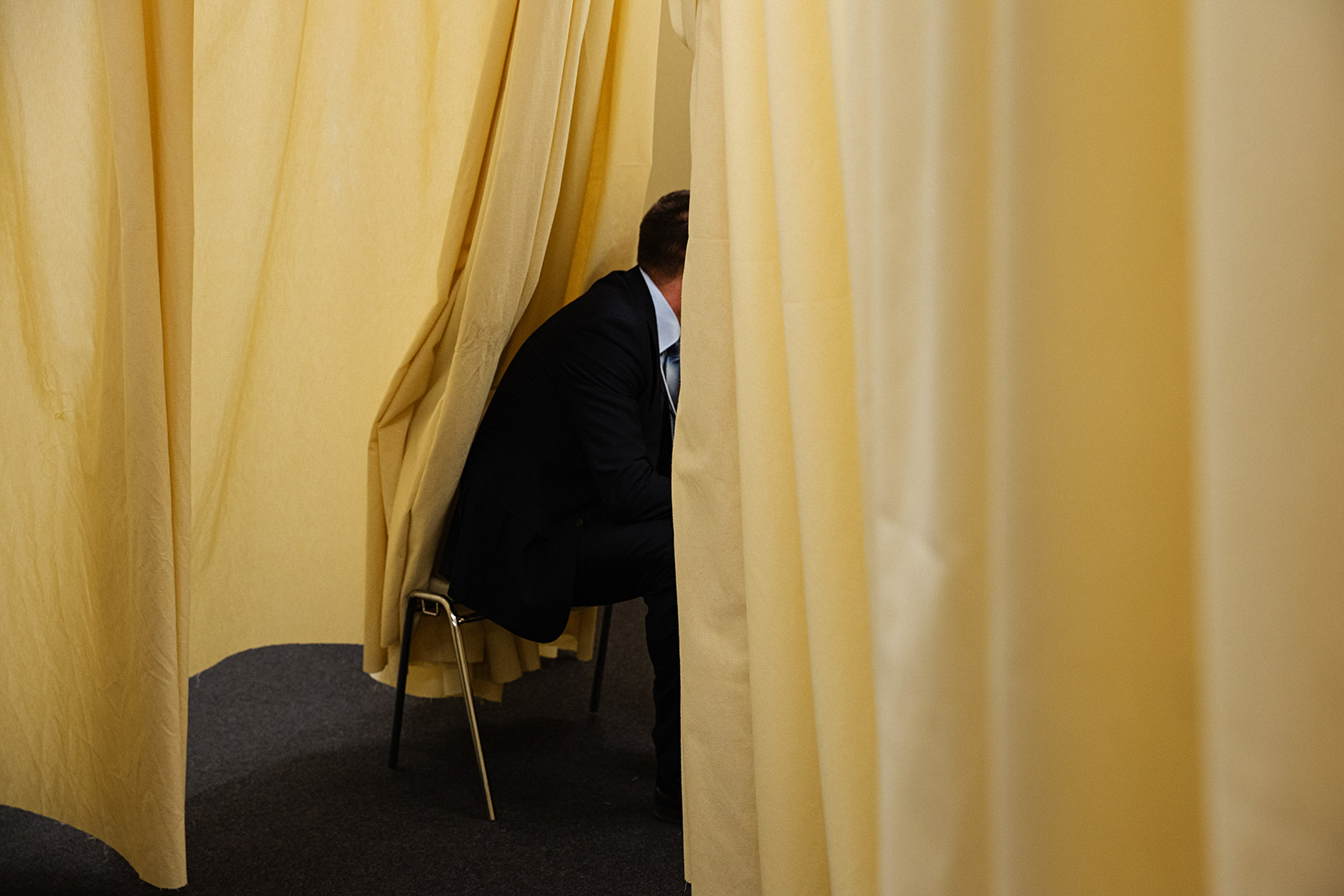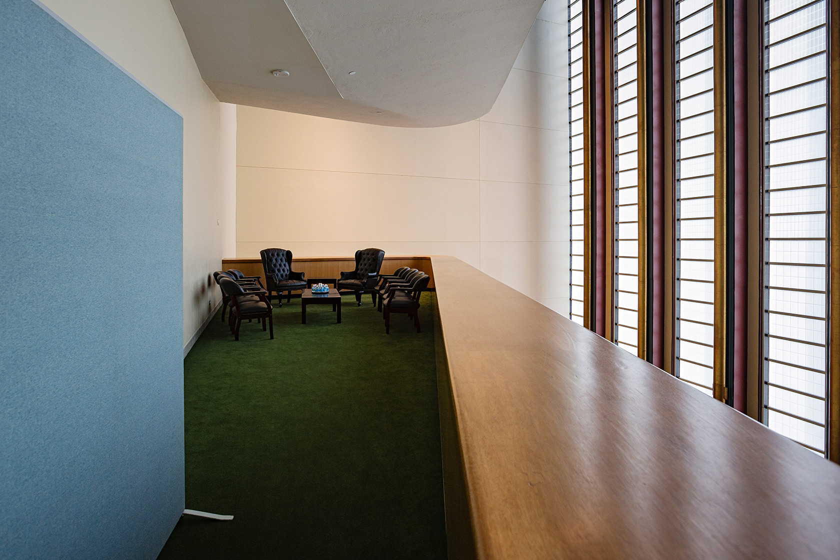 Світлини передають парадокс часу – тимчасові кімнати для планування довготривалих стратегій. Парадокс цінностей – мінімалістичні простори зі штучним освітленням, де вирішуються долі мільйонів людей та багатьох країн.