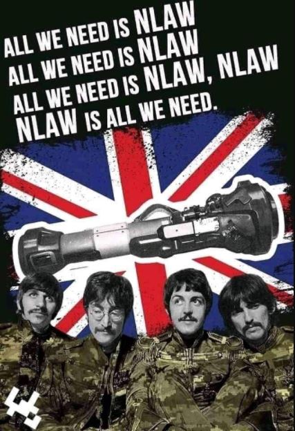 – І NLAW. Така класна штука. Мені якось прислали демотиватор, і я не втримався і відправив його пану Бену Уоллесу, секретарю з питань оборони Великобританії. Там картинка така: британський прапор, чотири обличчя музикантів із групи "Бітлз" і англійською мовою написано "All you need is NLAW, NLAW is all you need".