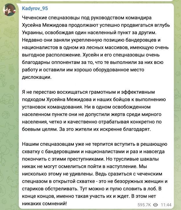 "Російські військовослужбовці чуйно ставляться до проблем мирних жителів," – пише глава Чечні у той час, коли окупанти обстрілюють мирні будинки, лікарні і блокують евакуацію цивільних. При цьому в Україні кадирівці нібито "звільняють" населені пункти від "бандерівців" і "нацистів"