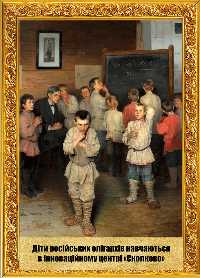 Західні країни запроваджують персональні санкції не лише проти російських чиновників та олігархів, а й проти членів їхніх сімей. Отже, їхні діти, закінчивши "Сколково" (картина художника Миколи Богданова-Бєльського "Усний рахунок"), зможуть піднімати рівень життя десь у районах російського Нечорнозем'я.