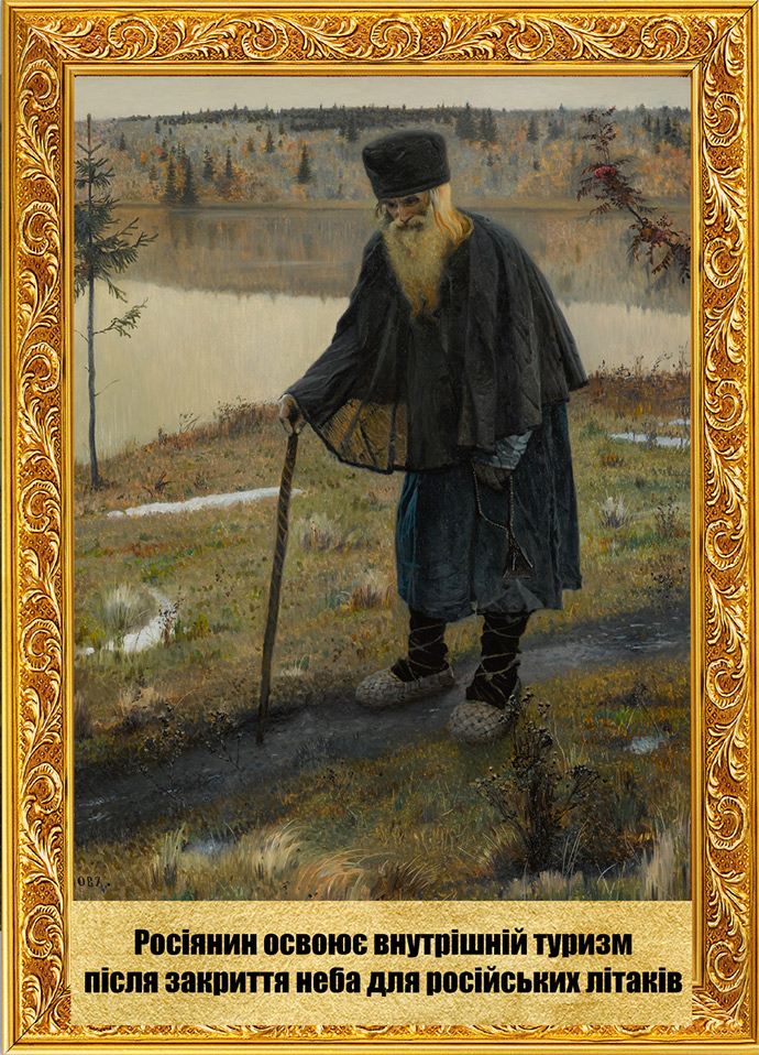 Після того, як для російських літаків закрили свій повітряний простір майже чотири десятки країн, включаючи країни ЄС, США та Канаду, росіянам слідом за російським кораблем доведеться активніше освоювати внутрішній туризм. Як на картині Михайла Нестерова "Пустельник".