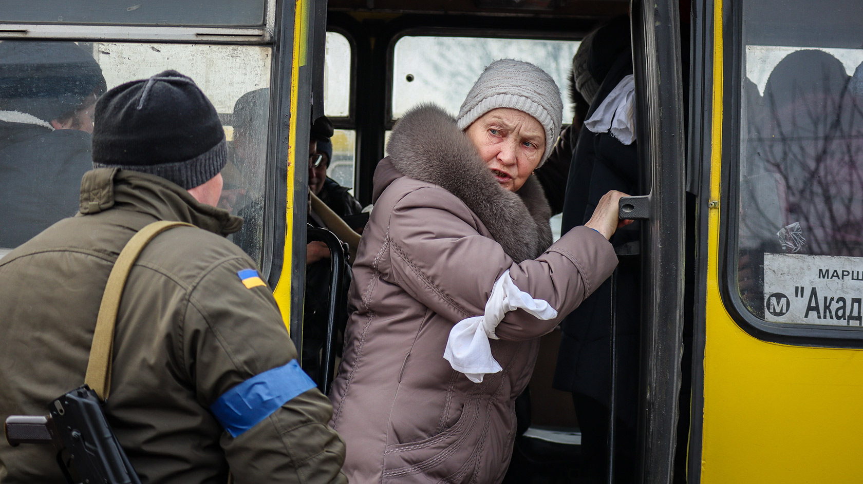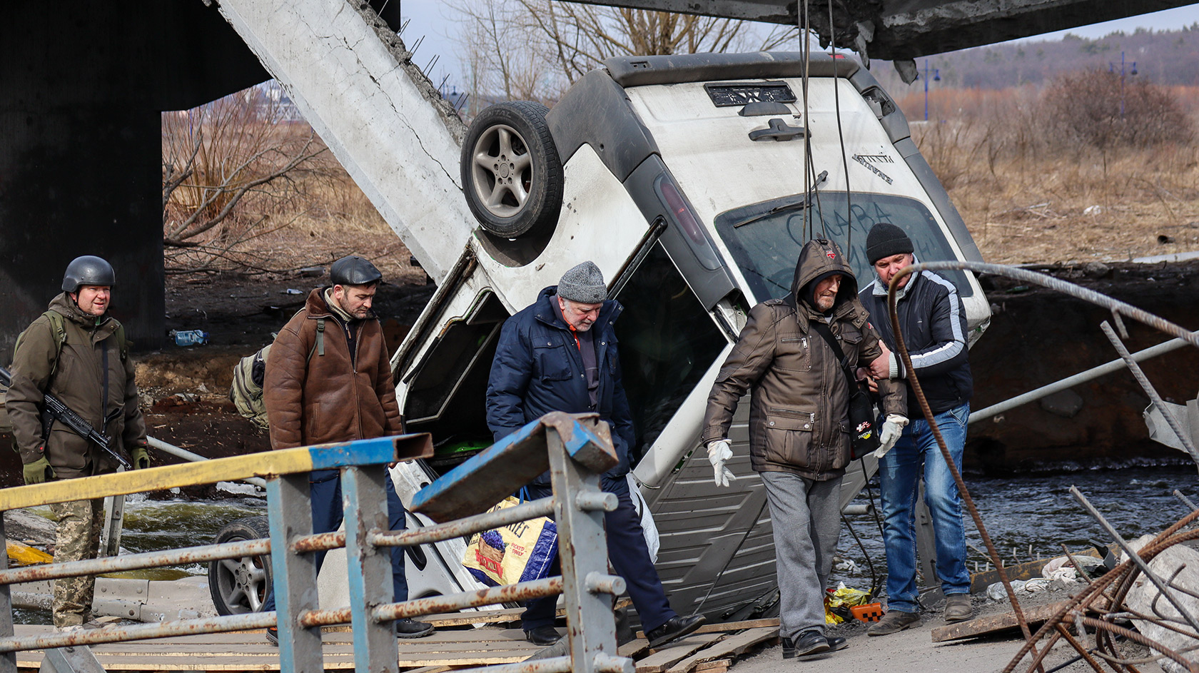 "Швидкі", автівки Червоного Хреста та цивільні мікроавтобуси під акомпанемент постійних вибухів і стрілянини під’їжджають до зруйнованого мосту, щоб забрати постраждалих. Літніх, дітей, домашніх улюбленців та травмованих людей виносять на руках через невеликий нашвидкоруч сконструйований перехід.